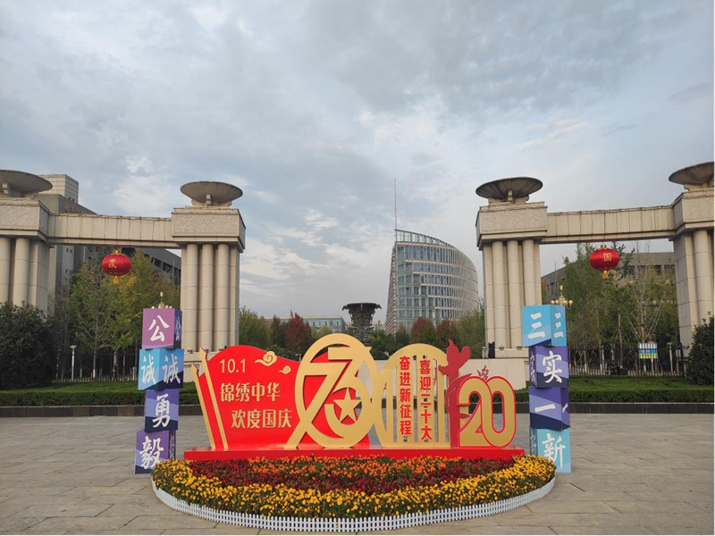 设置景观花坛,让校园环境美起来。在长安校区和尊广场、东篱菊园兰苑18号楼西侧广场、翱翔学生活动中心门前广场,友谊校区东1楼前广场分别设置“庆祝中华人民共和国成立73周年”“喜迎二十大、奋进新征程”国庆美陈摆放。