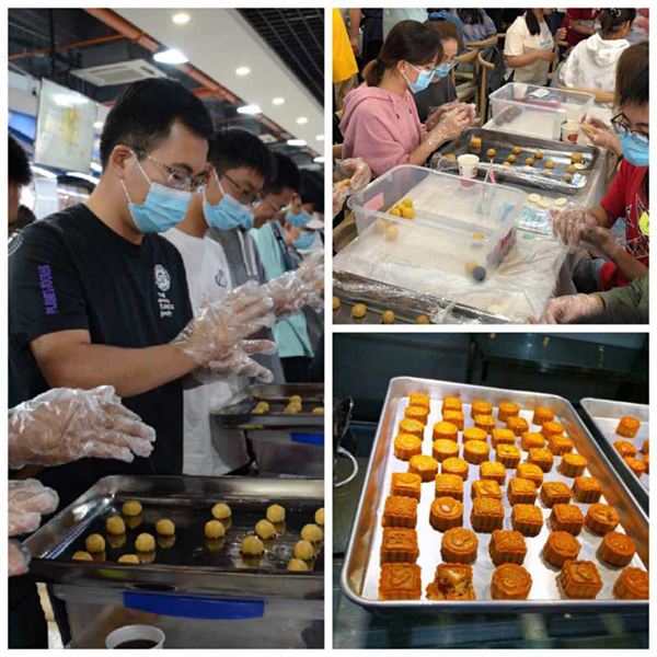 随后,海天苑餐厅的糕点师向大家详细介绍月饼的制作材料与流程。每一桌都安排了一位师傅手把手来帮助同学们制作月饼,让每一位同学都体验到了动手的快乐。同学们认真倾听,制作过程激动又兴奋。虽然同学们戴着口罩,可笑容从眼睛里溢出来,笑声从嘴角边跑出来,大家都徜徉在制作月饼的乐趣中。等待月饼烤制的过程中,餐厅工作人员还组织了竞答活动,并为同学们准备了学习用品及海天苑餐厅优惠券。整个活动在同学们的惊叹、欢呼中圆满完成。