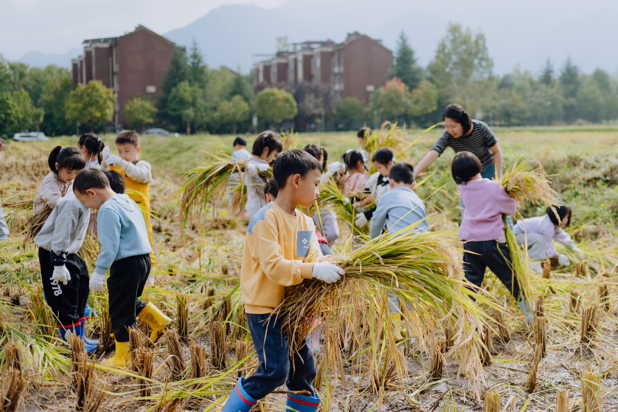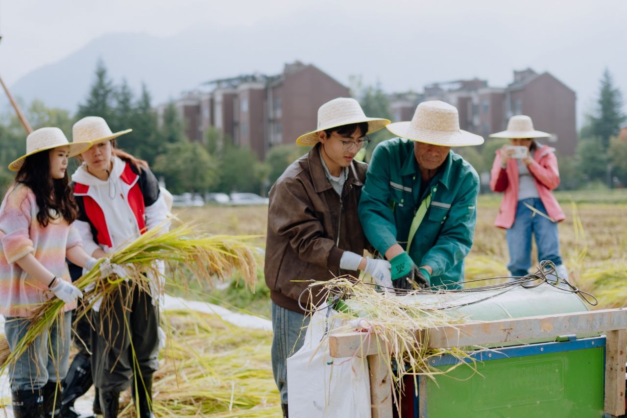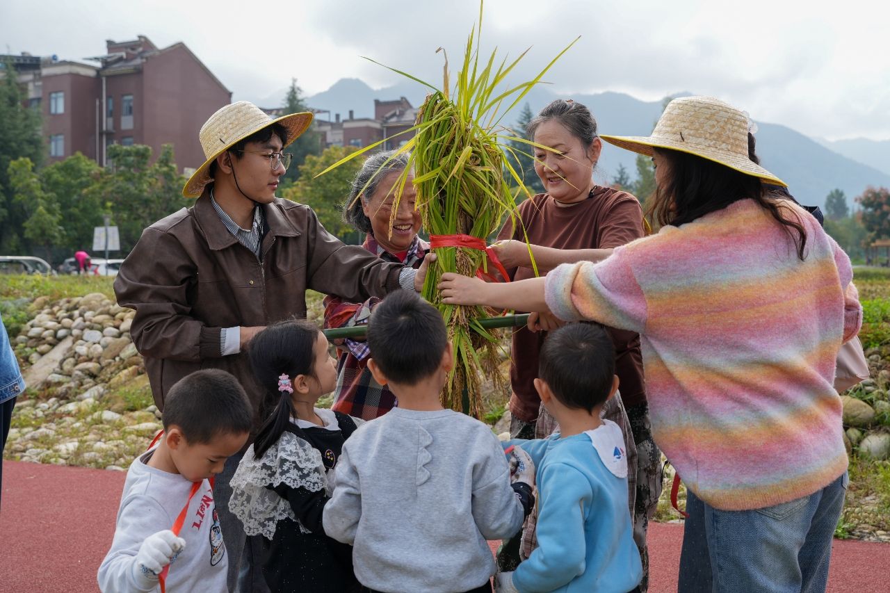 稻田之中,收割现场热火朝天。老同志俯身示范,手把手指导学生割稻技巧,汗水浸润笑容;大学生们认真实践,将一束束稻穗整齐收割,在一割一放间体会农事辛劳。小朋友们兴致盎然,仔细观察稻穗形态,协力将收获的水稻运至脱粒点,亲身体验“粒粒皆辛苦”的深刻含义。脱粒机轰鸣作响,金黄的稻谷倾泻而出,映照出众人脸上的丰收喜悦。