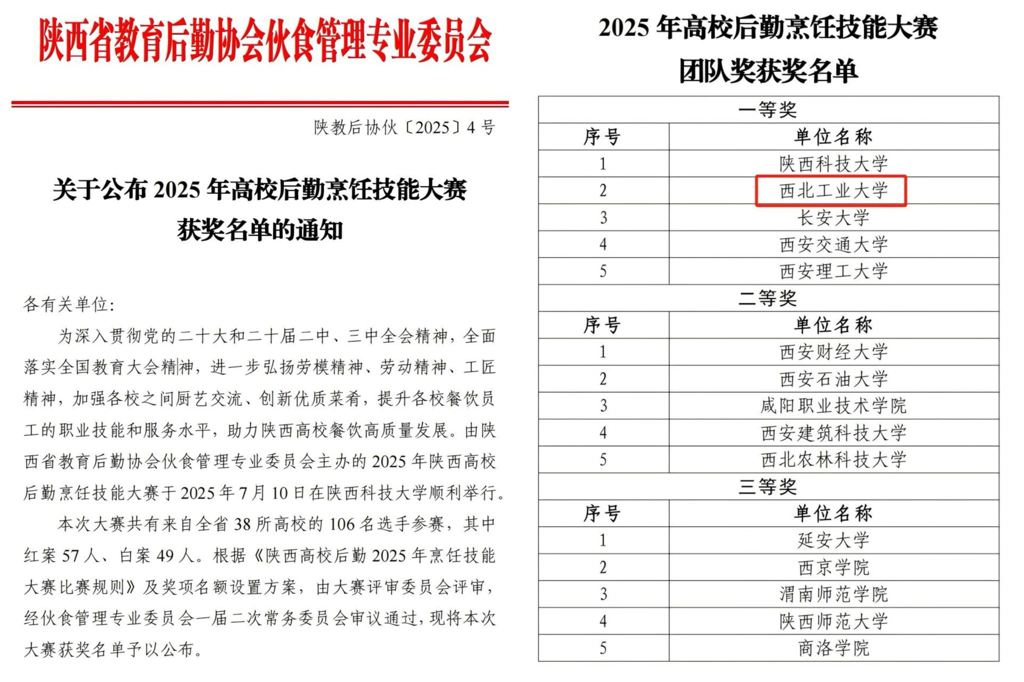 近日,在陕西省教育后勤协会伙食管理专业委员会公布的2025年高校后勤烹饪技能大赛获奖名单中,西北工业大学后勤饮食团队凭借扎实的技能功底、出色的现场发挥和稳定的综合表现,在全省38所高校、106名选手中脱颖而出,荣获团队一等奖,并在红案、白案个人单项比赛中摘得多个奖项,其中西工大包子荣获第一名,红案选手以扎实的烹饪功力荣获第四名,充分彰显出我校后勤餐饮队伍精湛的专业水平与精益求精的工匠精神。