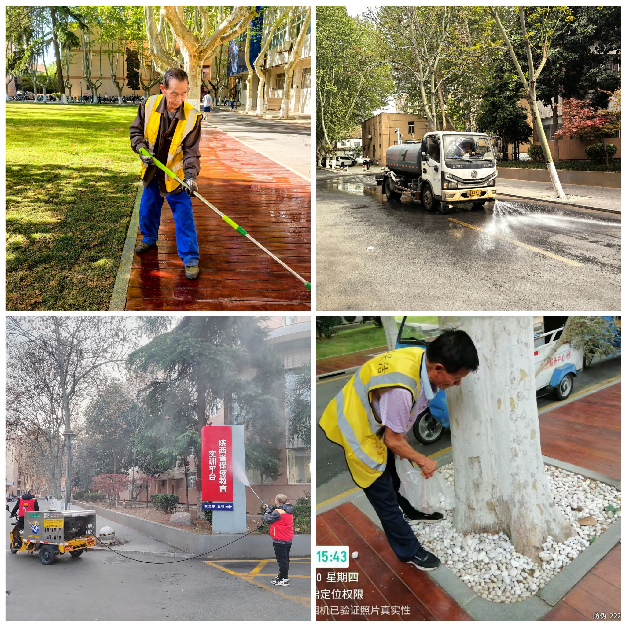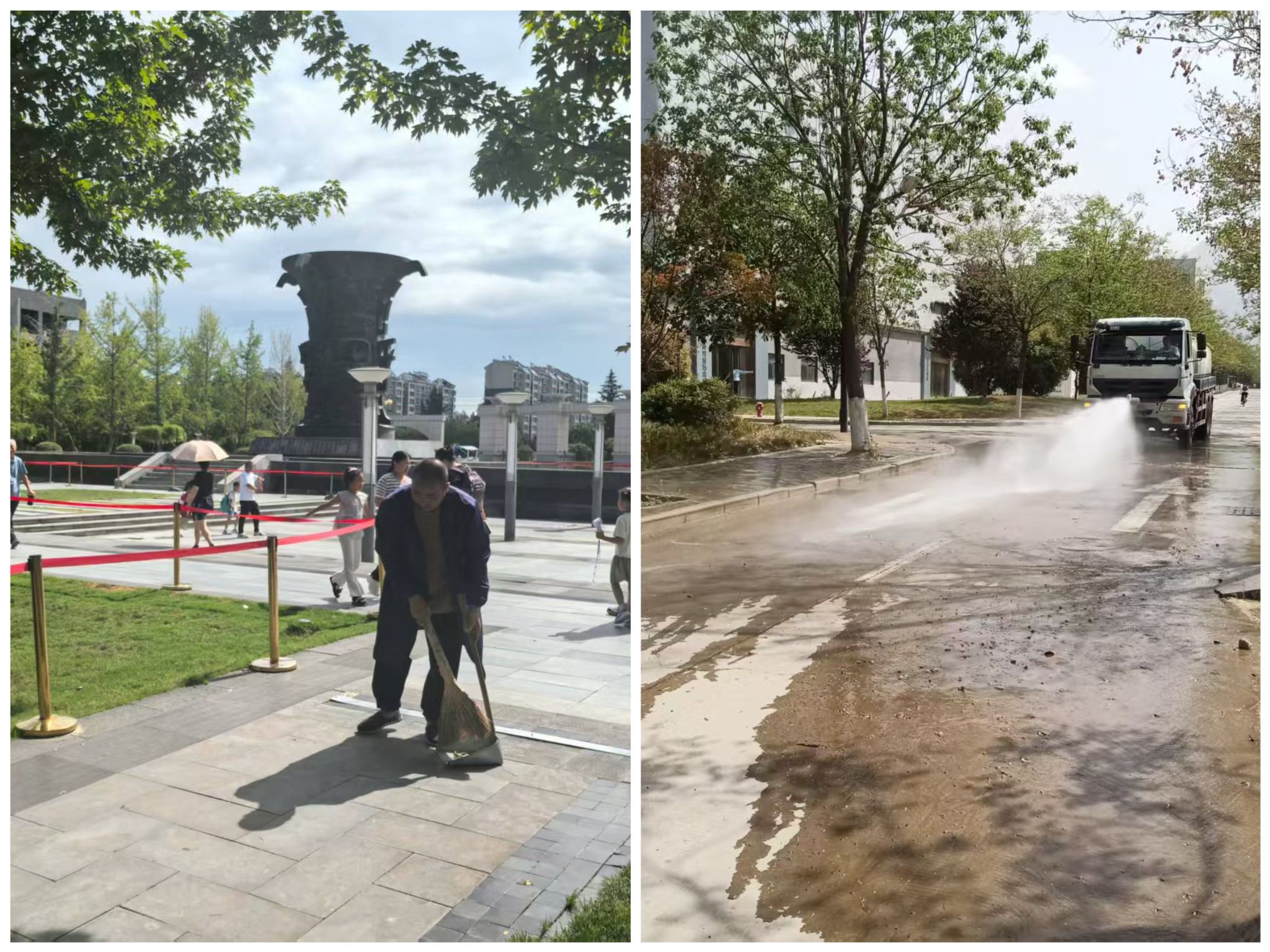 暑期校园开放期间,制定专项保障方案,日均出动洒水车6次、清扫车4次进行降温除尘。在重点区域及参观沿线日均部署20人次加强保洁巡扫,果皮箱日均清理4-5次,增设临时垃圾投放点9处,日均清运生活垃圾6-7吨,以整洁优美的环境展现了学校良好形象。