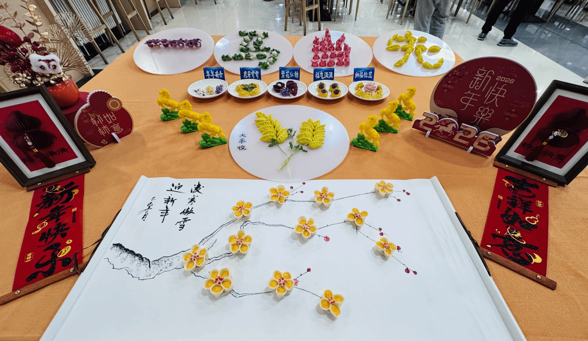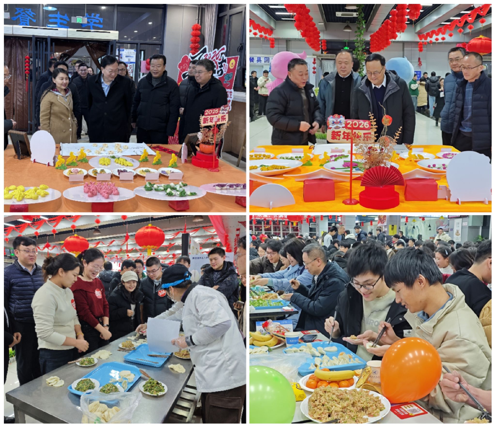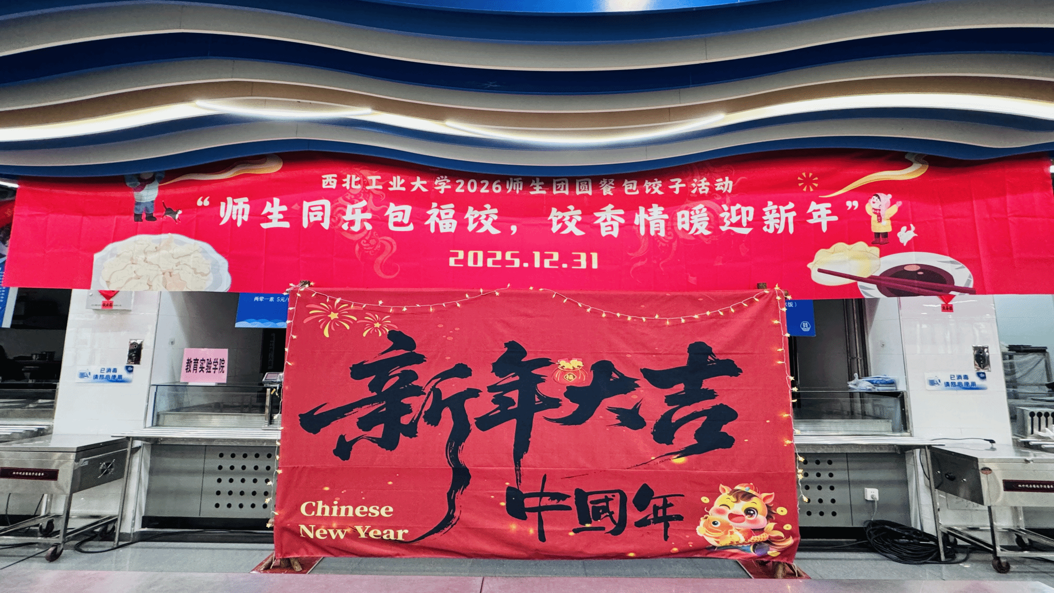 为确保活动有序进行,后勤饮食服务中心提前谋划、周密部署,制定详细服务方案。在食材准备上精心调配多种口味馅料,满足师生不同需求。同时,组织员工利用休息时间布置场地,悬挂红灯笼、张贴窗花、装饰中国结,营造出浓郁的跨年氛围。