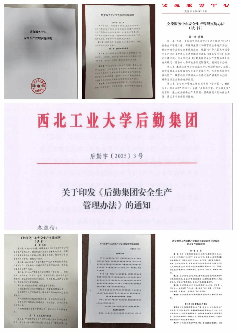 按照集团发展实际,全面梳理安全生产工作职责,制定后勤集团《安全生产管理办法》《突发事件应急预案》等文件23个,指导中心制定安全生产管理实施细则等,进一步完善了信息报告制度,细化了管理要求。强化安全生产考核,制定《后勤集团安全生产考核办法(试行)》,推动安全生产责任与绩效考核挂钩,驱动全员安全生产工作积极性和主动性,实现责任全覆盖、管理无盲区、成效有提升。