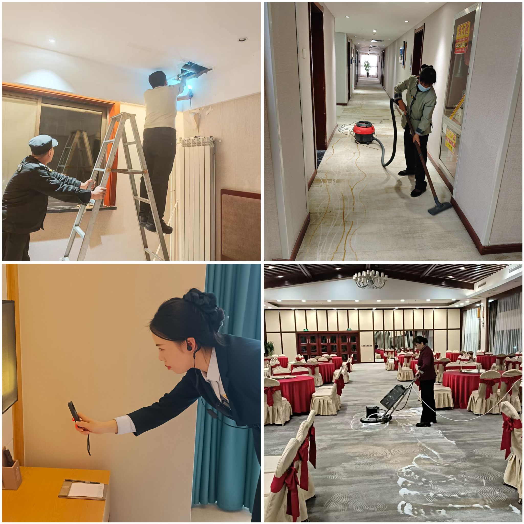 在环境优化方面,全面开展深度清洁与品质提升。从大厅玻璃的明亮通透,到铁艺装饰的一尘不染,再到客房角落的深度除尘,每一处细节都用心打磨。餐厅包间沙发、地毯及后厨冰箱的深度清洗,部分区域壁纸的精心更换,让服务环境面貌焕然一新。目之所及皆是整洁舒适,身之所感尽是温馨雅致,为宾客营造出如家般的入住体验。