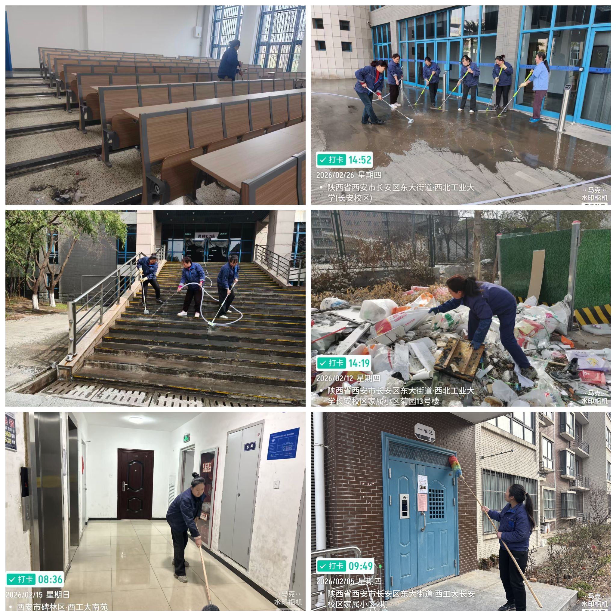 楼宇环境方面,集中对教学楼、公寓楼、教职工住宅楼等区域开展精细化清洁与隐患排查。春节前重点清理住宅楼道杂物,本月累计清运无名垃圾22车、建筑垃圾34车,完成多户周转公寓退费手续。