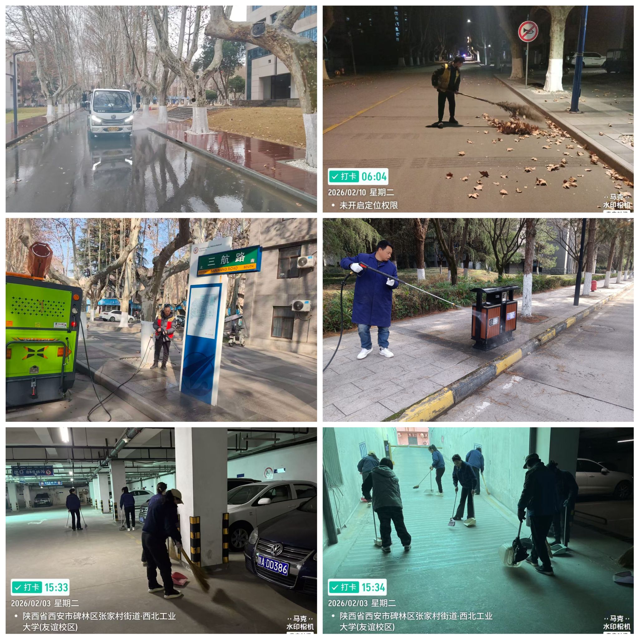 室外环境方面,环卫保洁员根据天气变化及时做好落叶清扫与清运,抓住雨雪天气有利时机对路面及道牙集中冲洗,完成校园内果皮箱、引导牌等附属设施清洗,确保校园整洁有序。同时,组织员工对两校区地下车库进行专项清洁作业,保障车库环境干净整洁。